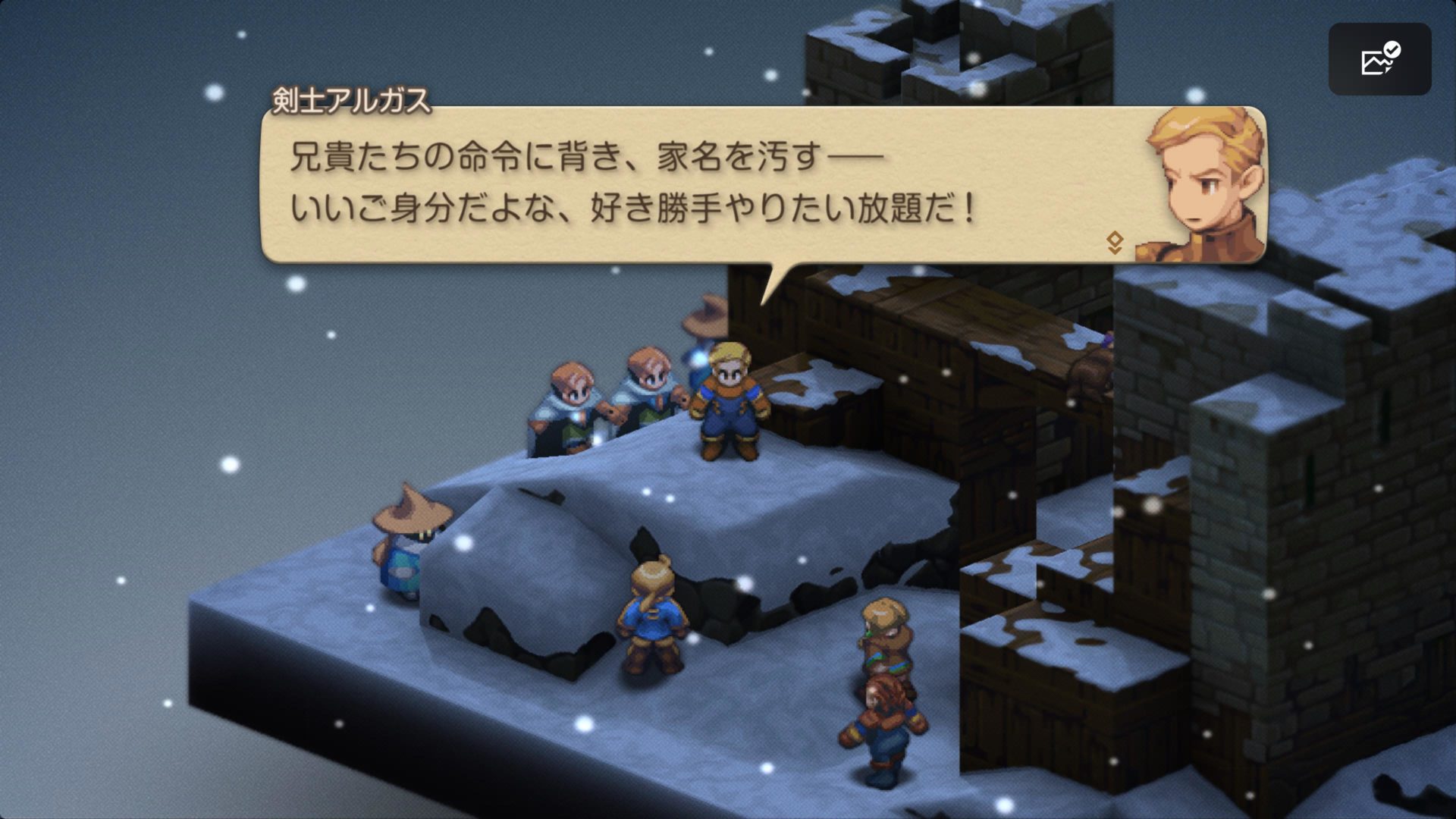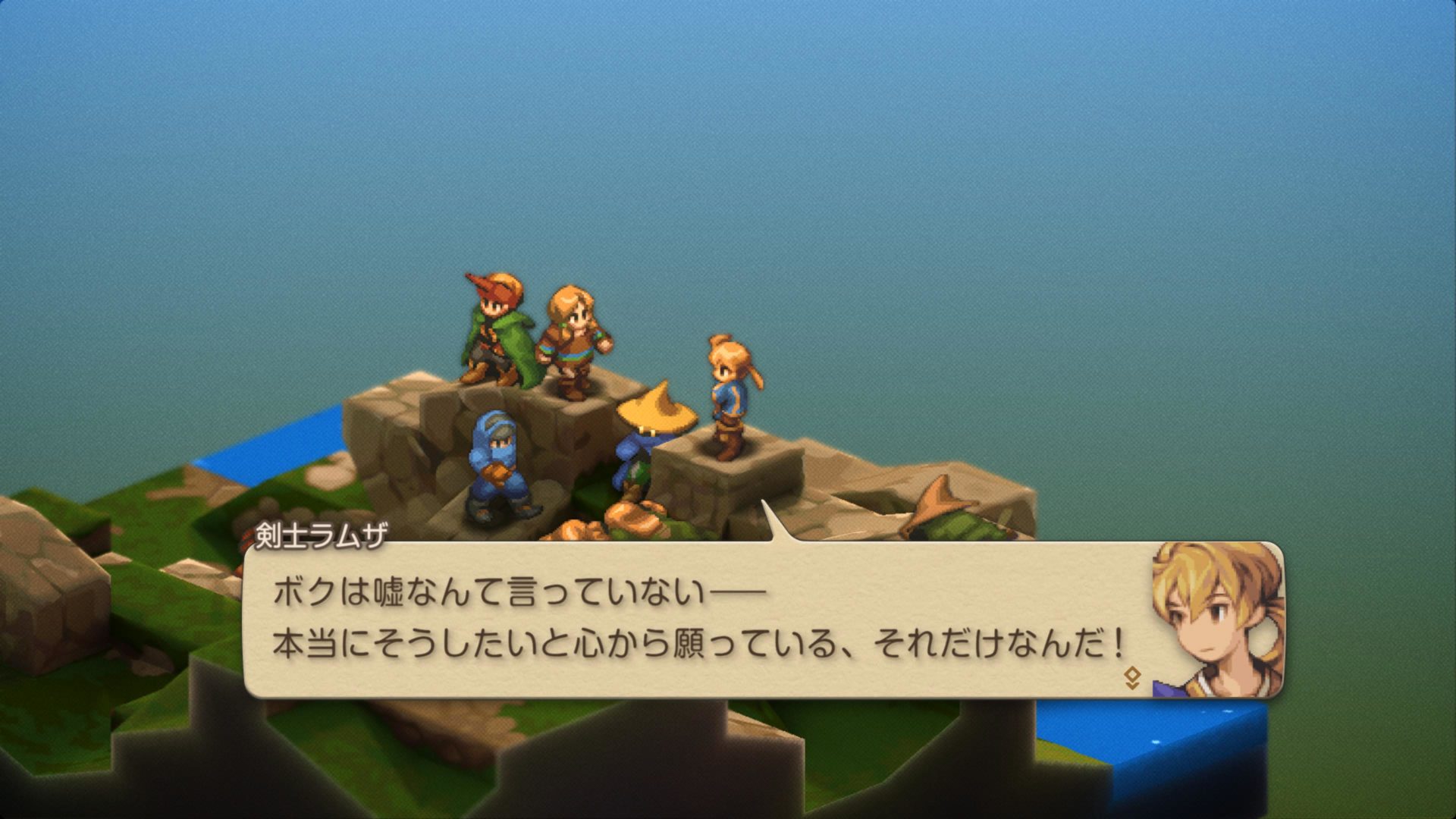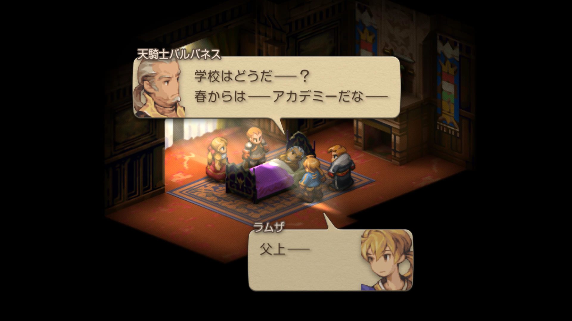 ドーターの高低差をうっかり(これ多いです)忘れてしまい、ラムザも倒れて「まずいまずい超まずい」と慌ててクリアした後のこのシーン。これもアルガスの印象的な場面ですね…吹き出しが逆転裁判化してますね(?)。そして、壁に凭れてじっと状況を見極めているディリータですが、Chap.1での彼は割と説明キャラ。穏やかなキャラですが(今のところ)、腹の内は既にどうだったんだろうなーと思います…。ラムザのことをどう思っていたのか(歯痒く思っていたかも)、自分の将来をどう考えていたのか気になりますね。この後はああなるわけですが、どんな変化が(声も!)あるのでしょうか。期待。