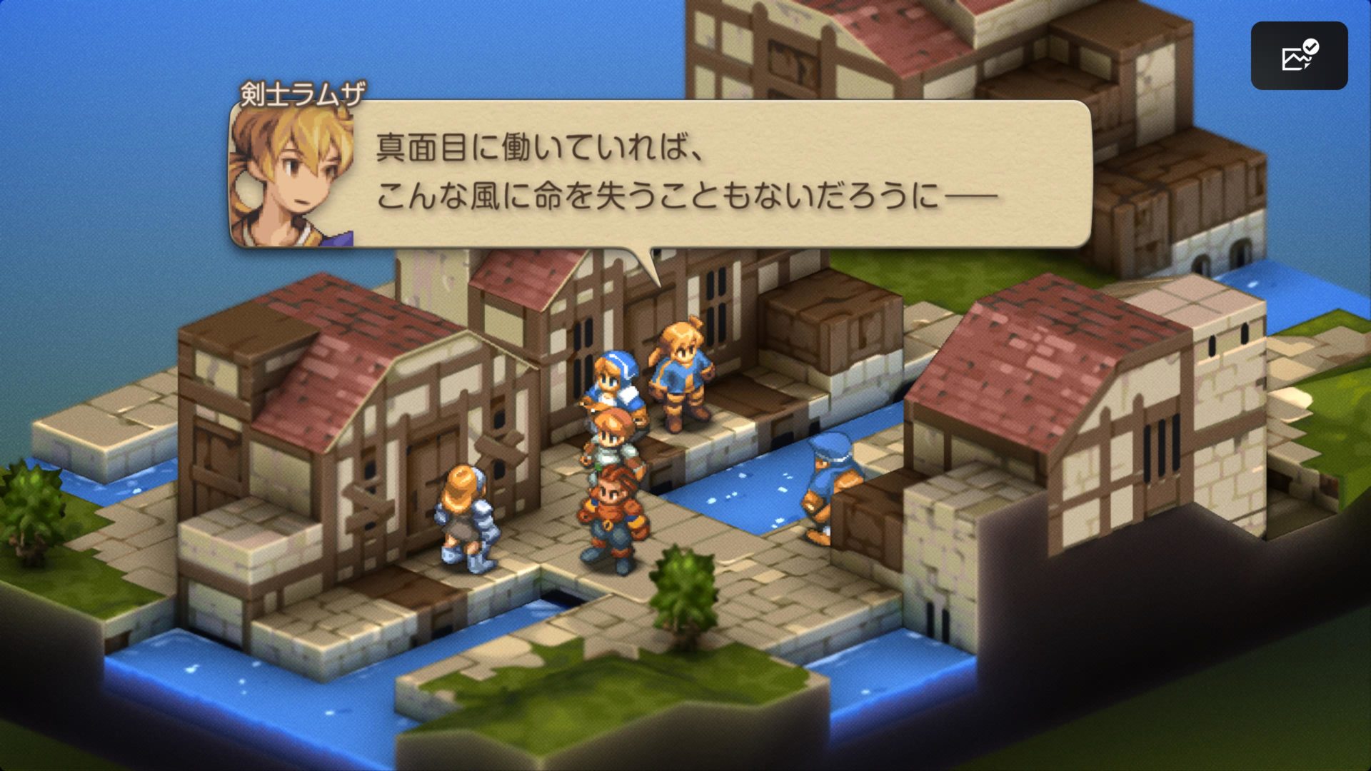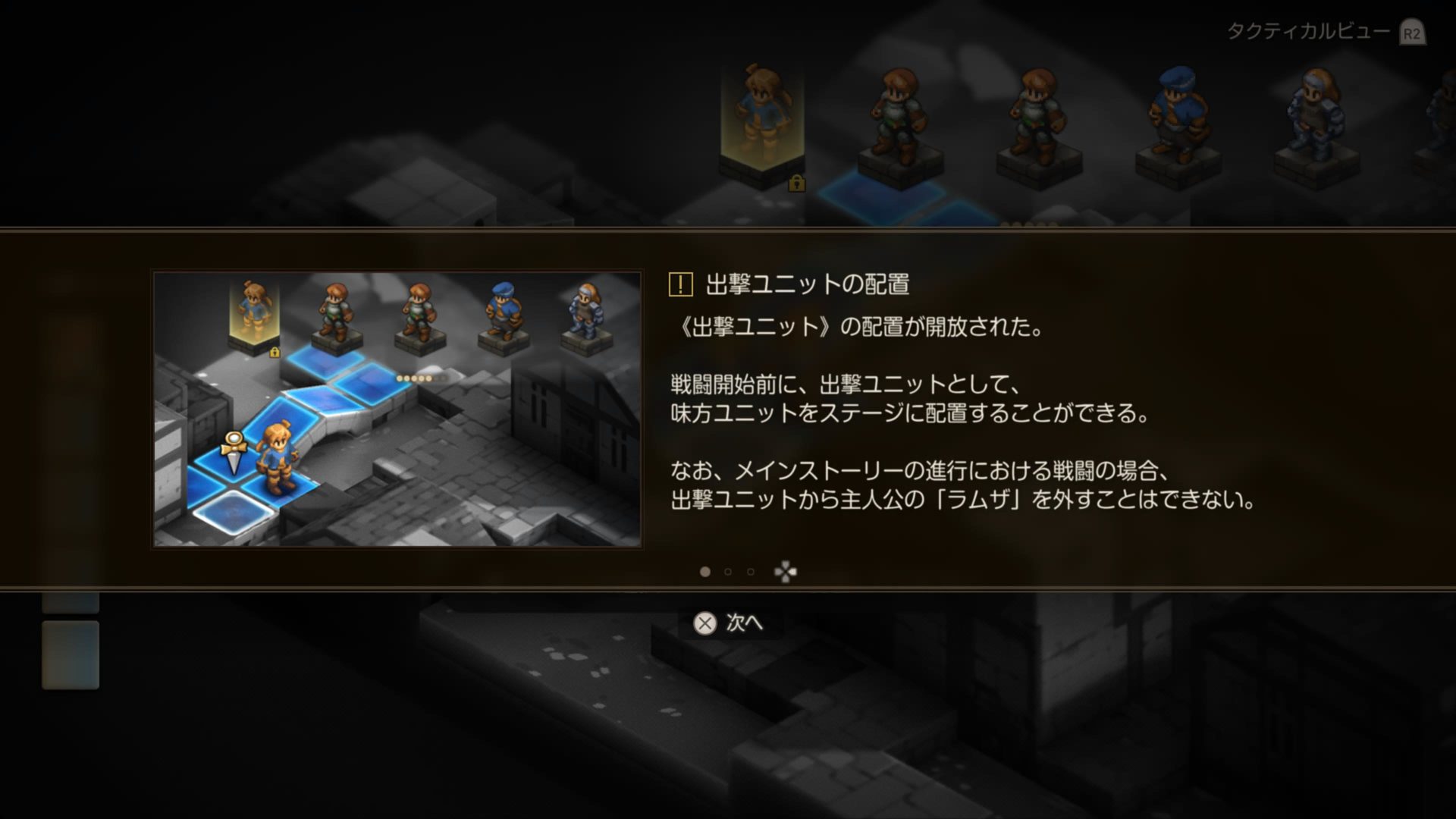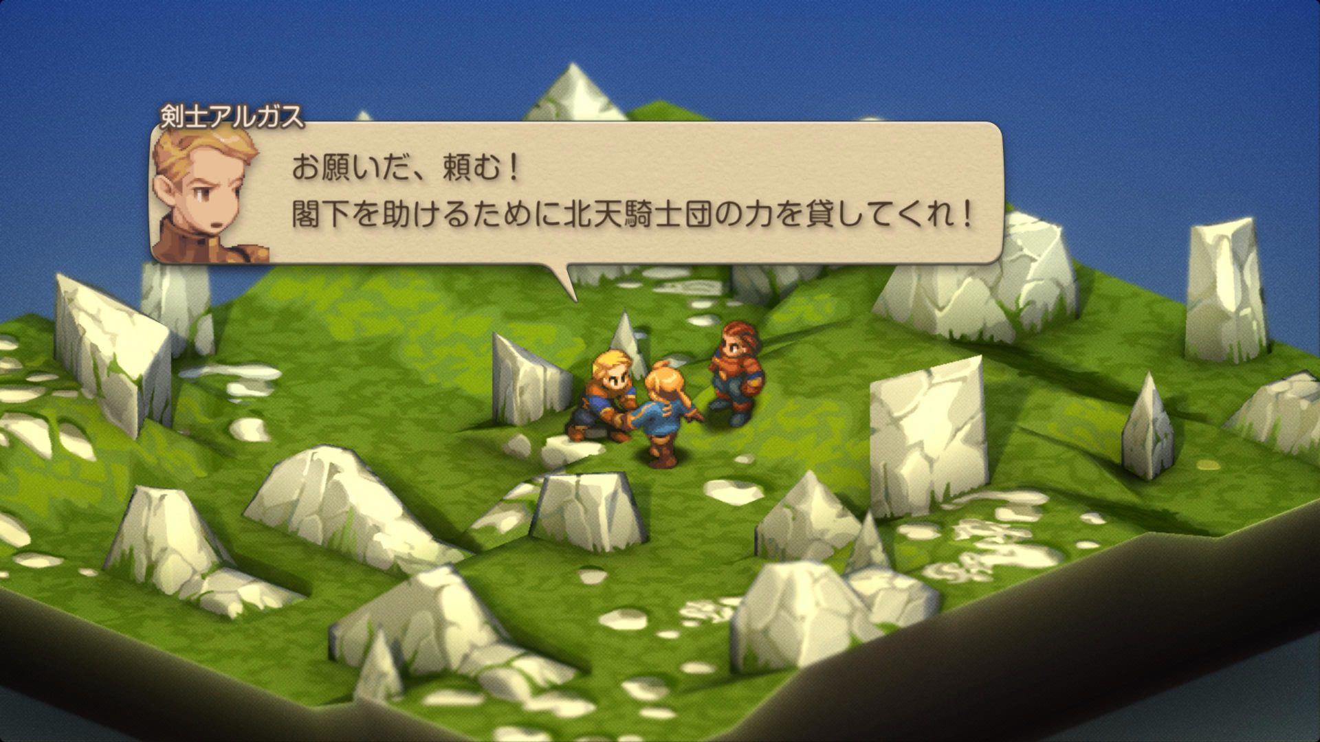 ドーターの高低差をうっかり(これ多いです)忘れてしまい、ラムザも倒れて「まずいまずい超まずい」と慌ててクリアした後のこのシーン。これもアルガスの印象的な場面ですね…吹き出しが逆転裁判化してますね(?)。そして、壁に凭れてじっと状況を見極めているディリータですが、Chap.1での彼は割と説明キャラ。穏やかなキャラですが(今のところ)、腹の内は既にどうだったんだろうなーと思います…。ラムザのことをどう思っていたのか(歯痒く思っていたかも)、自分の将来をどう考えていたのか気になりますね。この後はああなるわけですが、どんな変化が(声も!)あるのでしょうか。期待。