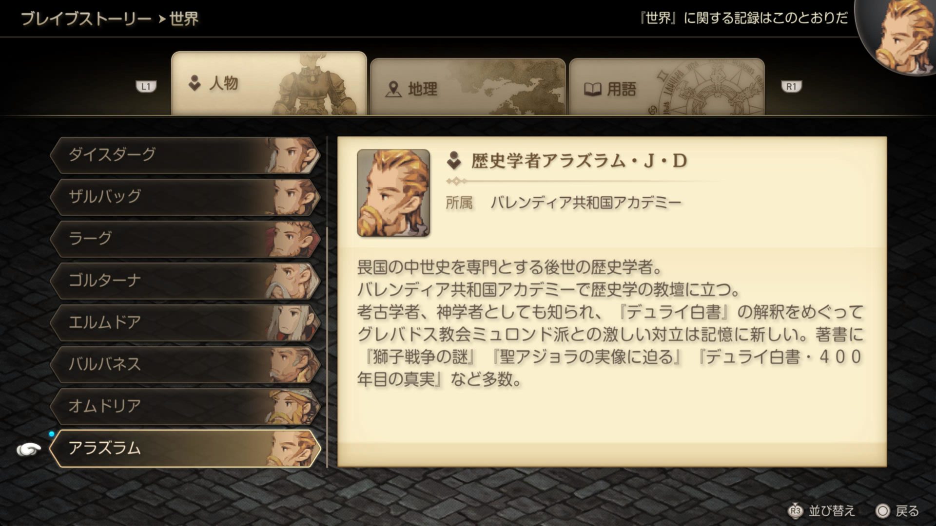 順不同でいうとですね、ガリランド戦が終わった後のブレイブストーリー?っていうの?編成画面ていうかシステム画面?のロアが16~!と思ってわちゃわちゃ見ていたら、アラズラム・J・D氏の所属にばったりぽんと倒れました。そう、そりゃそうだ! 確かに言われてみれば冒頭で論文出してたもんな! でも「ええええええ!?」と叫んだよ…<バレンディア あ、でもベイグラのバレンディアは王国です。