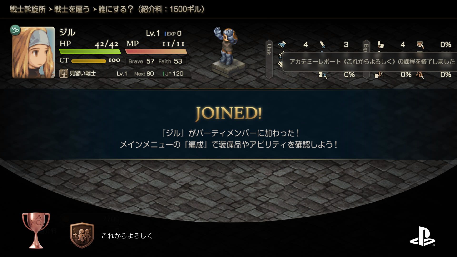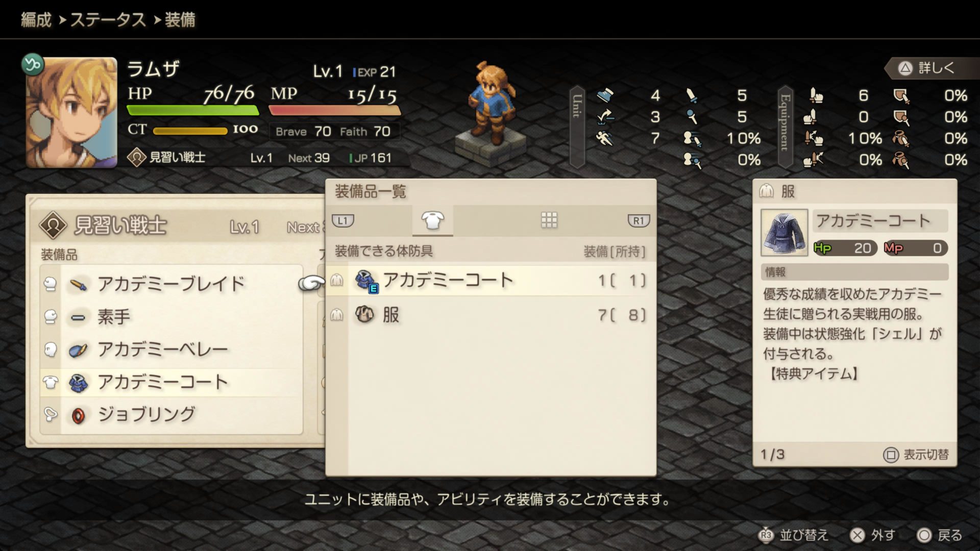 戦闘といえば、タクティカルビューがちょっと使い辛い。上から確認できるのはいいんだけど、斜めに少し傾けて見たいなというのがうまくできません。なんかどこかに操作できるんでしょうか。ちなみにガリランド戦は「投石投石おまじない(ラムザの時間つぶし)投石空気読まないディリ何もできないアイテム士さん(ディリ殴っとけばよかったな)」という感じでしたが、Jpアップは覚えられなかった…まだ確認していませんが。
