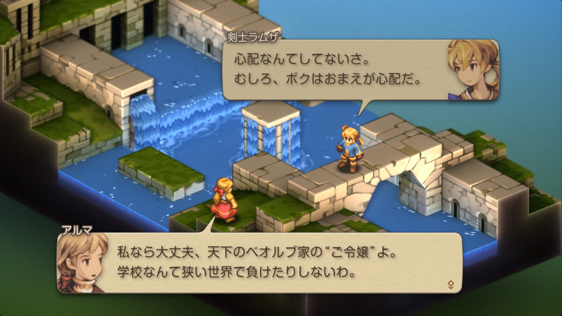 アルガスのしょんぼりエピソード(加筆ありましたね)の後にザルバッグ兄さんとティータがなんとも微笑ましく見えて、ティータが結構元気な声色で「お?」と思ったりもして(ディリータとの抱擁が切ない…)、そして唆されて、最後にこのやり取り。これも加筆されていると思う(たぶん)のですが、アルマの「ご令嬢」ぶりを見てみたかったかも…? 修道院から貴族学校だから奇異の目で見られていたか憧れで見られていたか。そも、何をするところなんでしょう? そういえばラムザだけではなく、アルマも妾腹なのだとするとここらへん複雑な気持ちになりますね。